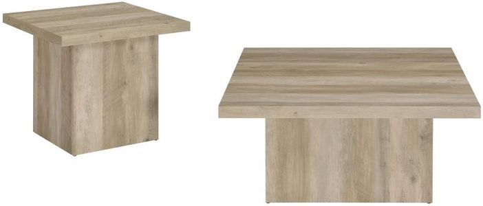Striking in form and rich in texture, this two-piece table set blends sculptural presence with rustic character. A square cocktail table and matching end table feature thick tops resting on bold plinth-style bases, creating clean geometric silhouettes.Read More