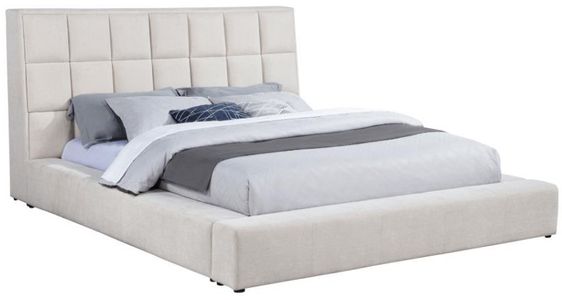 California king platform bed with oversized tufted headboard and sleek modern cream fabric upholstery
