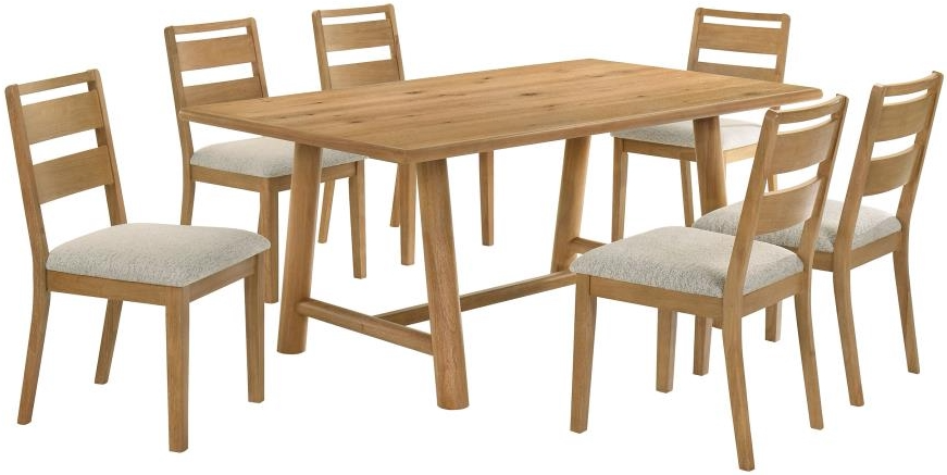 This rustic-meets-modern dining set offers a fresh take on everyday gathering. The rectangular table features a washed oak finish with a white oak veneered center and solid wood edge framing, all grounded by a trestle base with rounded posts for timeless appeal.Read More