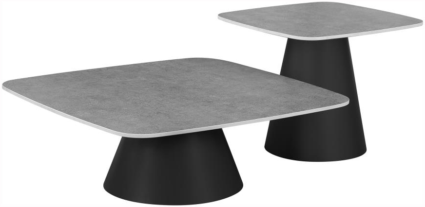 This two-piece coffee table set captures modern artistry through sculptural form and mixed materials. Each table features a square top with softly rounded corners in a concrete-look finish, perfectly balanced on matte black conical bases.Read More