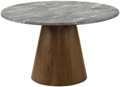 The veined grey top rests on an inverted conical pedestal in a rich dark oak finish, crafted from four interlocking panels with a tension lever table lock for seamless assembly. Ideal for seating four to six, it elevates any modern dining room.