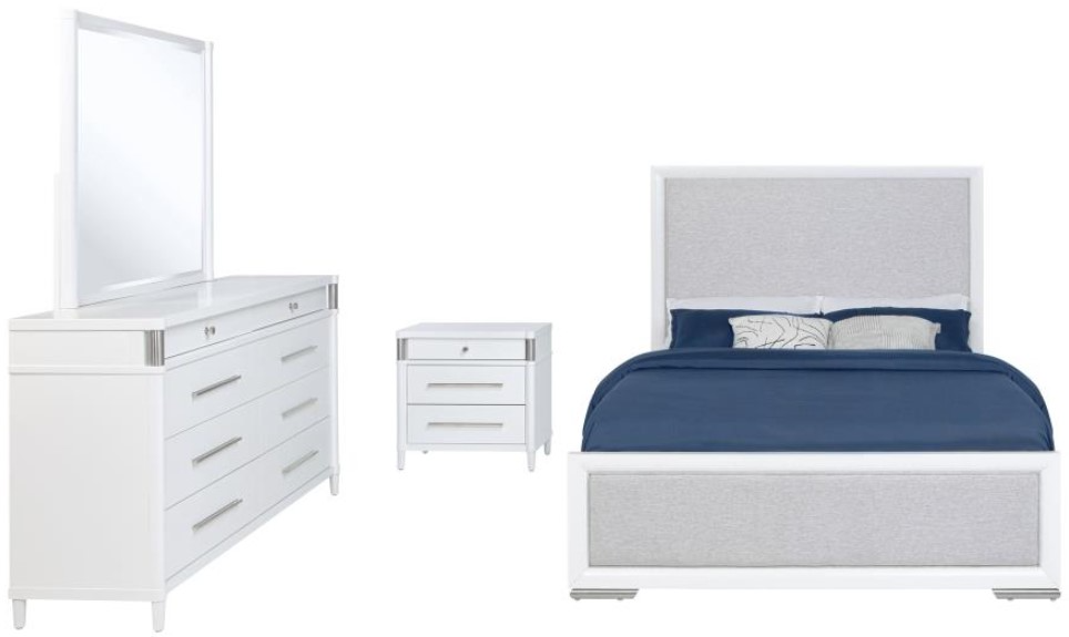 This bedroom set combines soft curvature and linear polish in a clean modern silhouette. Each piece features elongated brushed nickel pulls and subtle vertical tube accents that frame smooth white surfaces. The bed softens the look with a light grey upholstered headboard and footboard, adding contrast and comfort.Read More