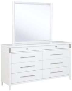 This eight-drawer dresser exudes modern sophistication through a sleek silhouette and softened edges. Elongated brushed nickel pulls and vertical tube accents create visual interest while enhancing the dresser’s clean structure. Built from solid rubberwood, engineered wood, and finished with a smooth laminate veneer, it offers ample storage and felt-lined top drawers.Read More