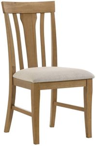 A fresh take on familiar tradition, this dining side chair pairs soft contours with classic craftsmanship. The sculpted slat back design adds character and support, while the padded light tan seat cushion provides lasting comfort.Read More