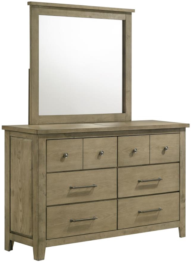 Six-drawer dresser with mirror pairs clean structure and subtle rustic appeal