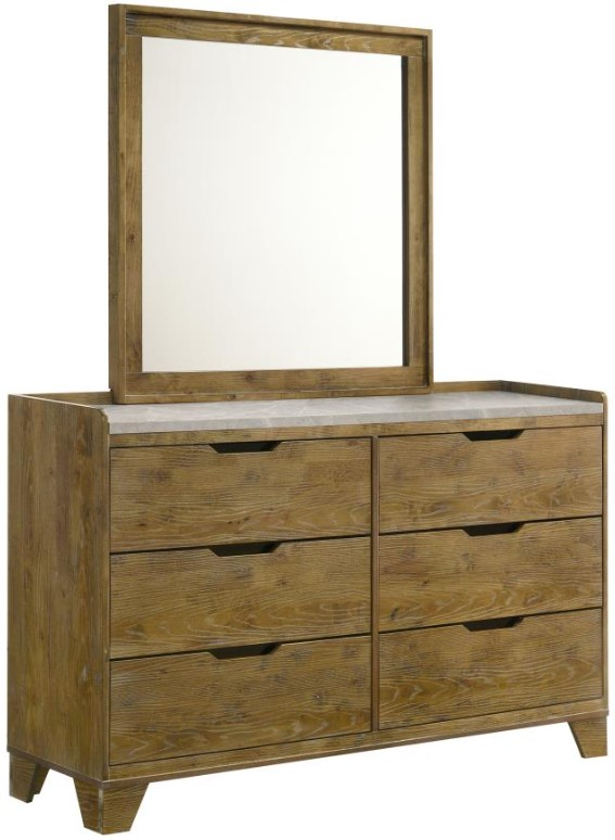 Six-drawer dresser with mirror combines rustic warmth and contemporary structure