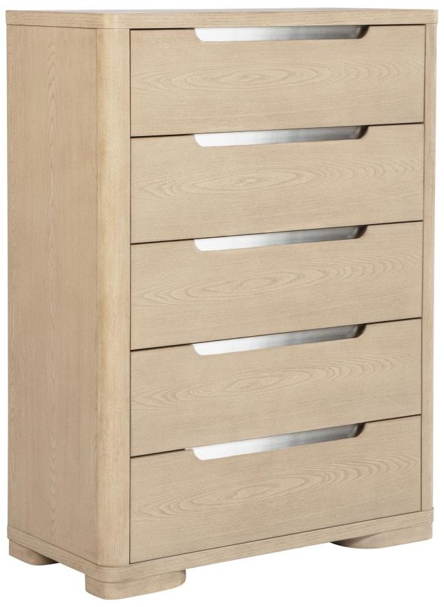 Five-drawer chest with a light elm finish for a contemporary, stylish look