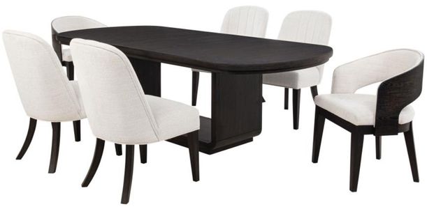 Designed for connection and crafted with grace, this dining set brings architectural beauty to everyday meals and special gatherings alike. A rectangular extension table, finished in burnished black, expands with a removable leaf and smooth cable glides to accommodate more seats with ease.Read More