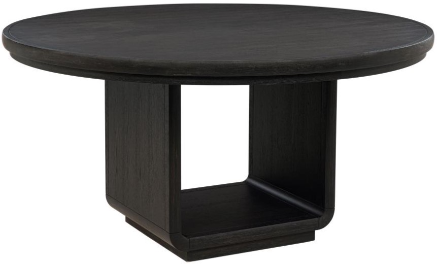 Sixty-inch round dining table finished in burnished black for a dramatic modern presence