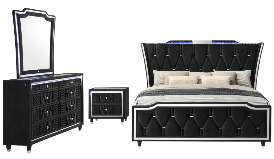 Unite form and function in this bedroom set, where sculpted glamour meets modern refinement. Each piece is wrapped in a black velvet with quilted textures, crystal knobs, and reflective acrylic accents. The dresser features a clear tempered glass top and LED case lighting without the fireplace insert.Read More