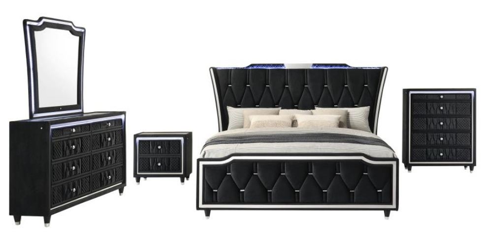 Unite form and function in this bedroom set, where sculpted glamour meets modern refinement. Each piece is wrapped in a black velvet with quilted textures, crystal knobs, and reflective acrylic accents. The dresser features a clear tempered glass top and LED case lighting without the fireplace insert.Read More