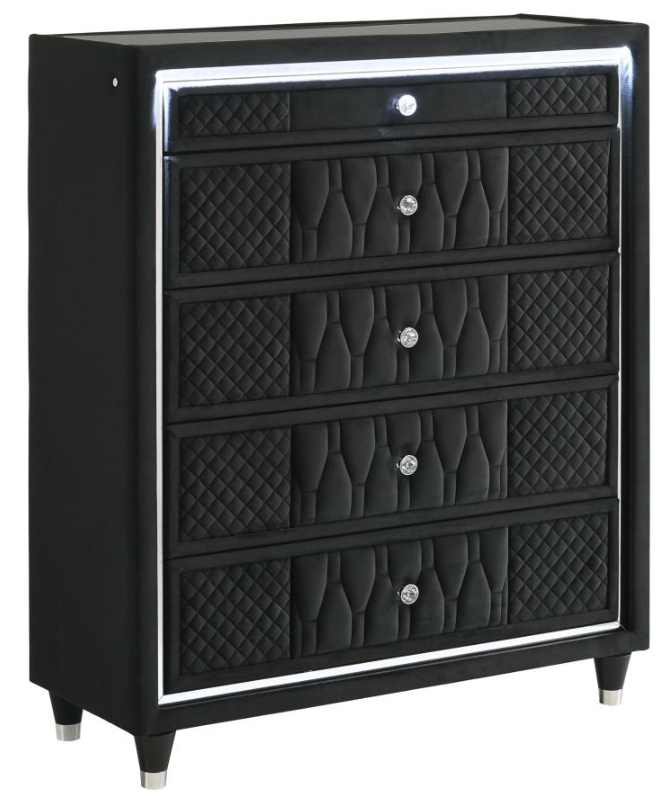 Embrace elegance in full velvet with this five-drawer chest, where ambient lighting meets refined craftsmanship. Upholstered in a stunning black velvet, each drawer is adorned with quilted textures, reflective acrylic accents, and crystal knobs for a soft yet glamorous presence.Read More