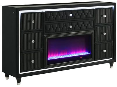 Infuse your space with cozy glamour in this eight-drawer flame box dresser, richly upholstered in black velvet. A built-in LED flame visualizer is framed by clear tempered glass and acrylic details, while crystal knobs and quilted velvet drawers shine with elegance.Read More