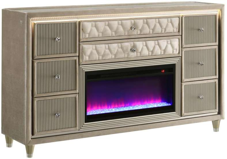 Infuse your space with cozy glamour in this eight-drawer flame box dresser, richly upholstered in ivory and camel velvet. A built-in LED flame visualizer is framed by clear tempered glass and acrylic details, while crystal knobs and quilted velvet drawers shine with elegance.Read More