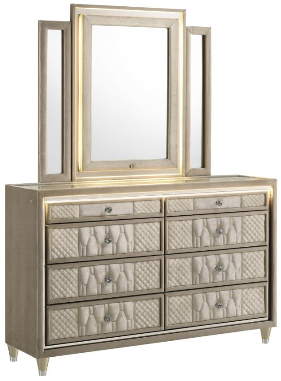 This dresser and mirror set blends soft velvet textures with luminous design for a refined bedroom statement. Fully wrapped in ivory and camel velvet, the eight-drawer dresser features a clear tempered glass top, LED trim, crystal knobs, and reflective acrylic touches. Above, the tri-panel mirror offers LED lighting and velvet framing.Read More