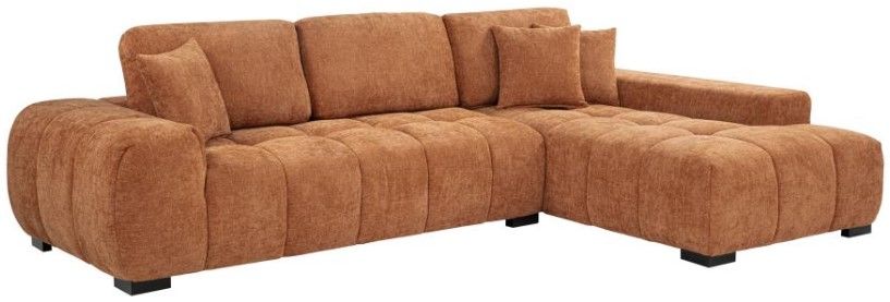 Sectional in orange fabric features a sculpted right-side chaise for extended lounging