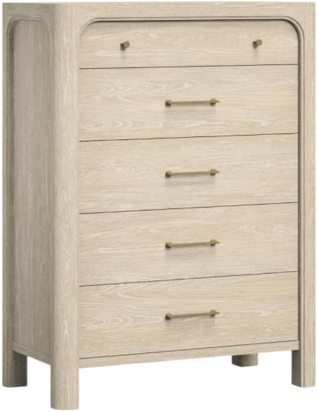 Gracefully composed with rounded edges and sculptural form, this five-drawer chest evokes a quiet sophistication. Its tall silhouette offers a sense of order, while sculpted corners and subtle detailing bring soft elegance to the bedroom. A felt-lined top drawer and hidden compartment add thoughtful layers of function.Read More