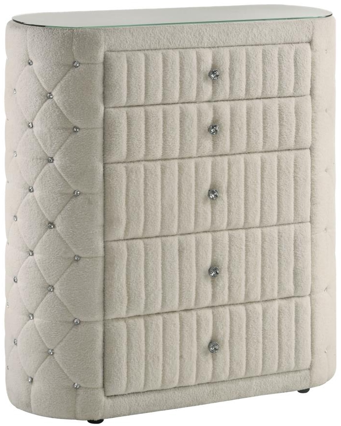 Elevate the everyday with a chest of drawers that exudes sophistication and softness. Upholstered in ivory boucle, this tall silhouette is adorned with five vertically channeled drawers, each accented by glistening crystal-style pulls.Read More