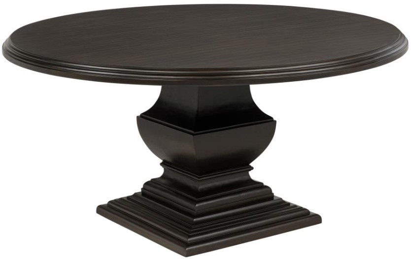 A commanding presence meets graceful symmetry in this round dining table, designed to anchor formal gatherings with timeless elegance. The expansive tabletop rests on a tiered pedestal base that echoes classical architectural forms, all wrapped in a rich dark cocoa finish.Read More