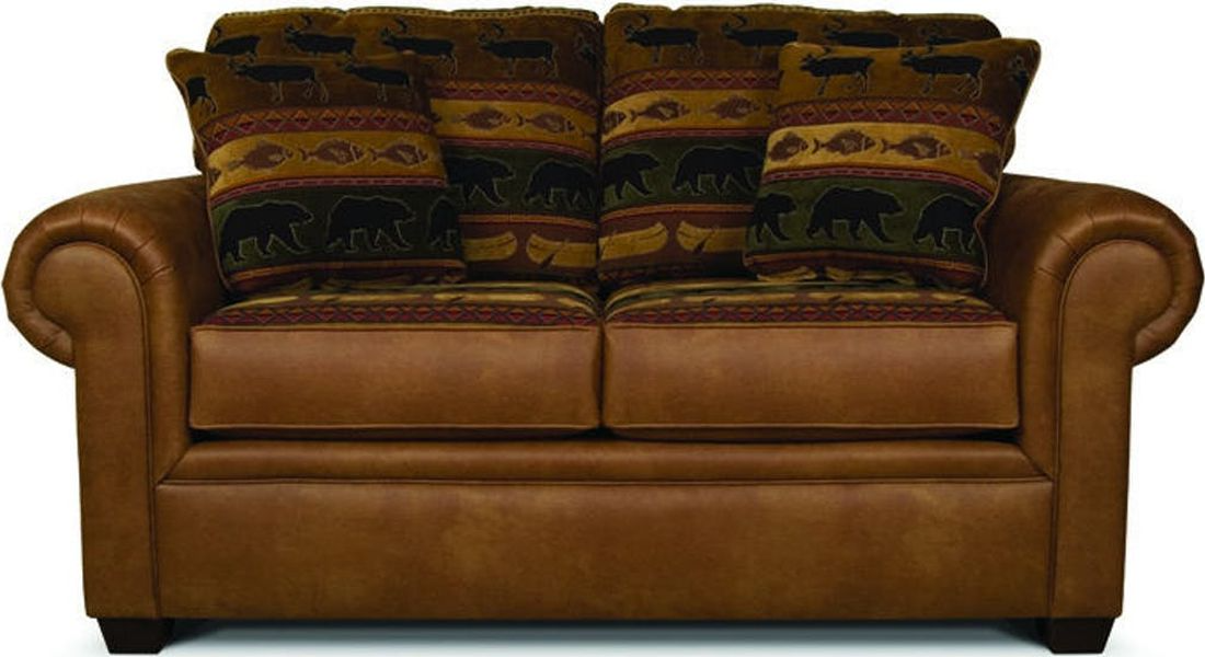 The lodge look is alive and well in our Jaden group. A three cushion style in married fabrics with pyramid legs and rolled and welted arms. Toss pillows are reversible. Novelty patterns combined with a leather-look fabrics provide the perfect choice for your cabin or retreat home.Read More