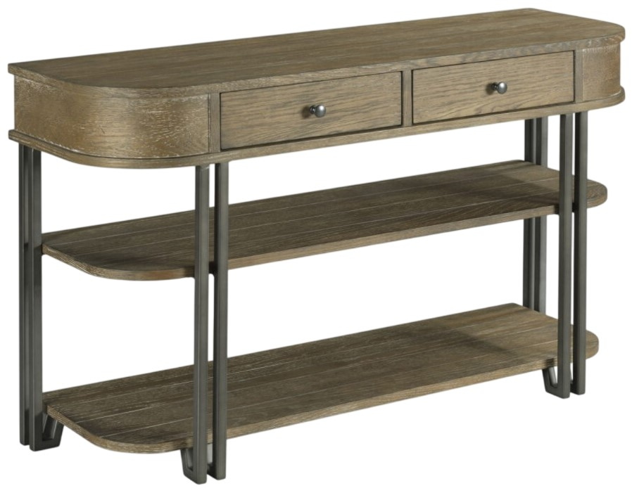 The Saddletree brown sofa table is crafted from Rubberwood solids and oak veneers in a rich Saddletree Brown finish. Featuring two drawers and two open lower shelves, it provides ample storage while its sleek, industrial-rustic design makes it a versatile and stylish addition to any living space.Read More