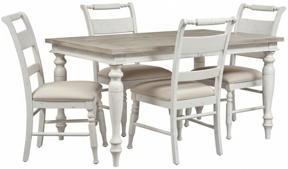 Design possibilities are endless with the Whitney five-piece rectangular table set. Crafted of rubberwood solids with oak veneers, this set features an antique linen finish with weathered gray tops and consists of the leg table and four slat back side chairs.Read More