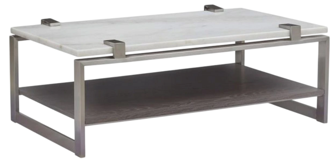 Magnussen® Home cocktail table featuring a pearl white marble top, roasted almond finished shelf and brushed platinum frame.Read More